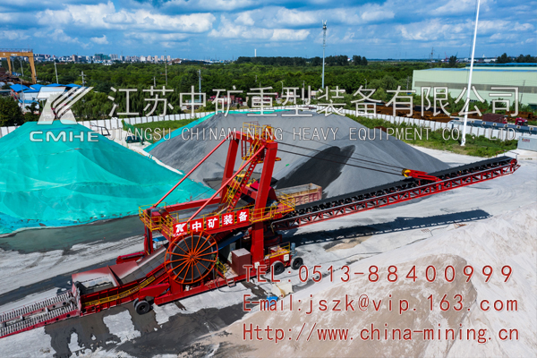 該設備包括行走機構;鏈板進料裝置;帶式輸送機系統;臂架俯仰機構;臂架旋轉機構;卡車爬坡裝置;液壓系統;控制系統;配電系統(移動式電站)等。全部系統可以在堆場場地內移動,行走機構的行走輪采用重載汽車實心輪胎,無須在堆場內布置固定軌道,增加堆場利用率;進料裝置與輸送懸臂集為一體,二者均安裝于一個公共底盤之上,構成一體式移動堆高機;臂架俯仰機構采用鋼絲繩俯仰形式,臂架旋轉機構采用回轉減速電機和回轉軸承,配電系統采用發電機組和電纜卷筒供電,整個系統具有完整地獨立性。