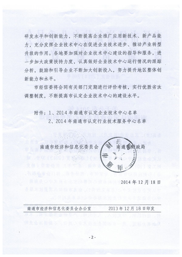 公司榮獲南通市認定企業技術中心