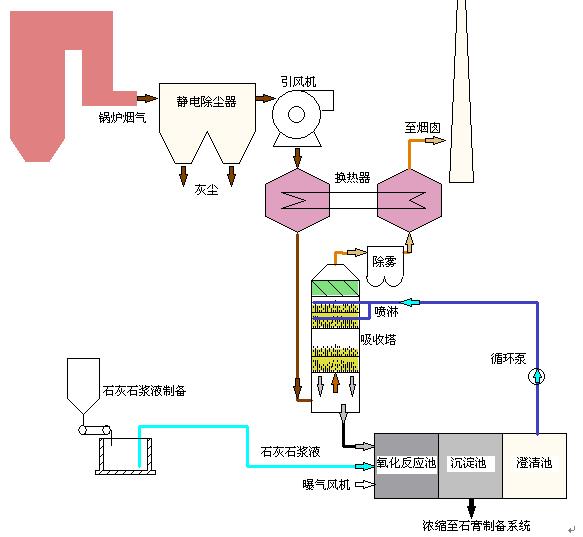 一、濕式石灰(石)/石膏法煙氣脫硫技術(shù),其工藝流程圖如上: 鍋爐煙氣在吸收塔內(nèi)與石灰(石)粉形成的漿液進行逆流接觸反應。吸收塔下段低PH值有利于氧氣和石灰石溶解,上段較高PH值有利于吸收反應,提高脫硫效率。
