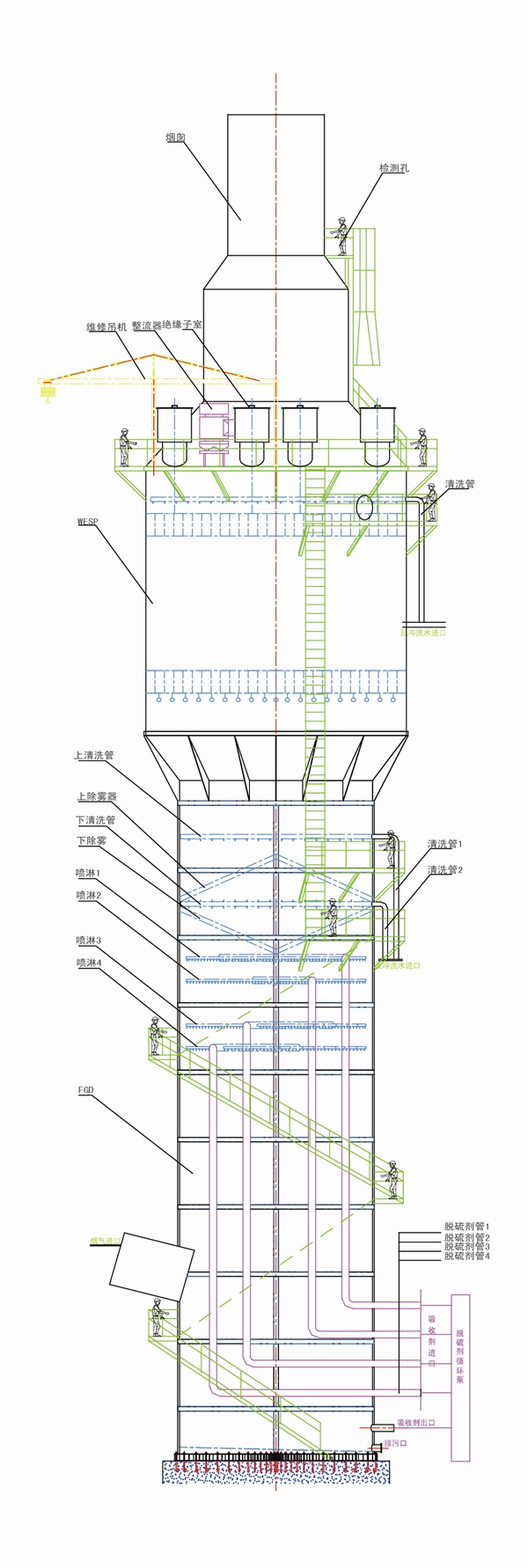 WESP本體采用圓形結構,設有煙氣導流板和氣體分布板,外殼體為碳鋼,內襯玻璃鱗片防腐。WESP出口的頂部,安裝直排煙囪,降低煙氣的阻力WESP脫除了凈煙氣中的液體,收集后的液體自流返回吸收塔。