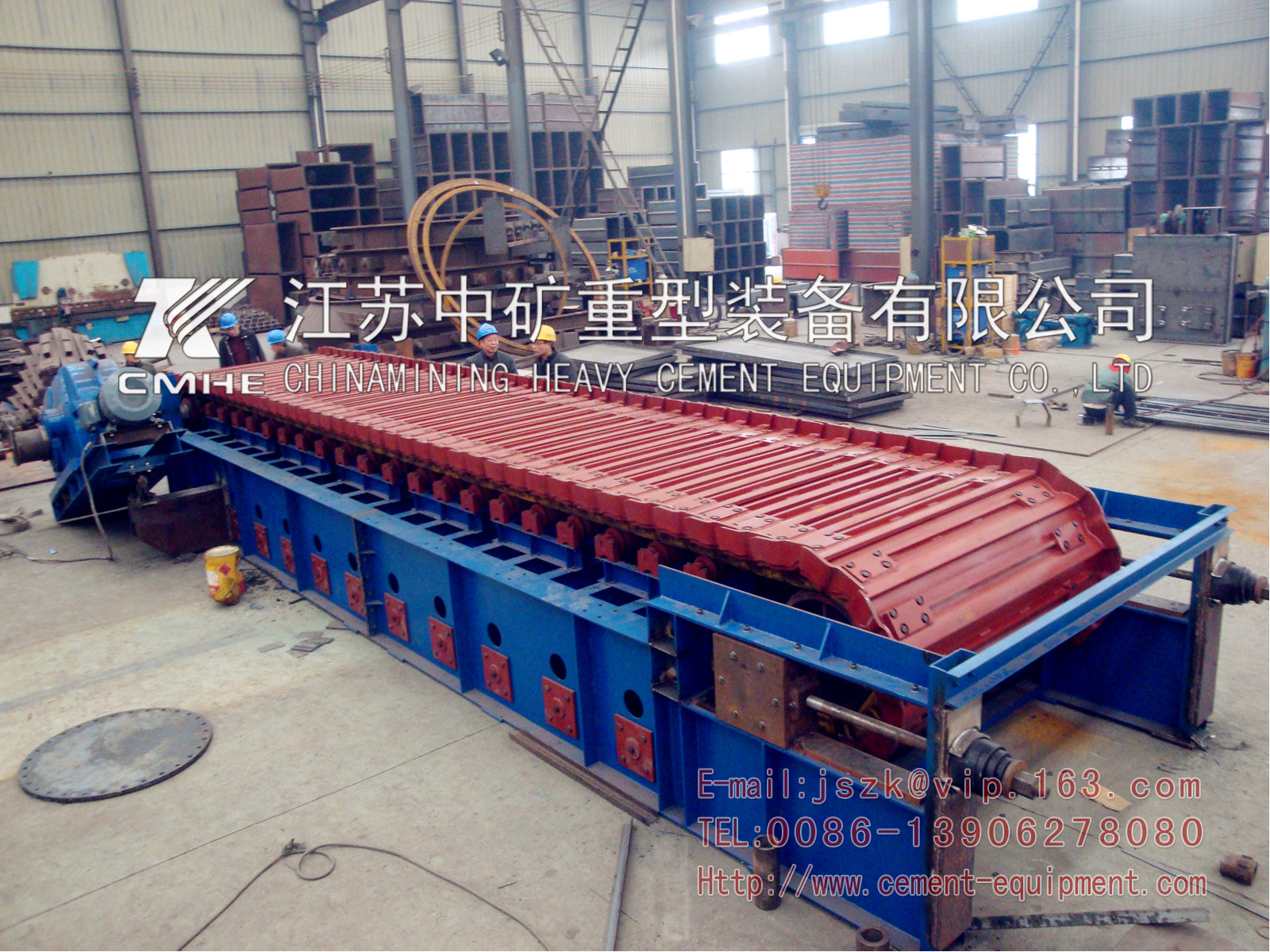 6、按輸送槽的寬度,對槽體的支承分為兩種形式。當輸送槽寬度小于或等于1600mm 時,由固定在輸送槽兩端的棍輪支承槽體,滾輪沿支架的上下導軌運行。當輸送槽寬度大于1600mm時,由固定在機架上棍子支撐槽體。