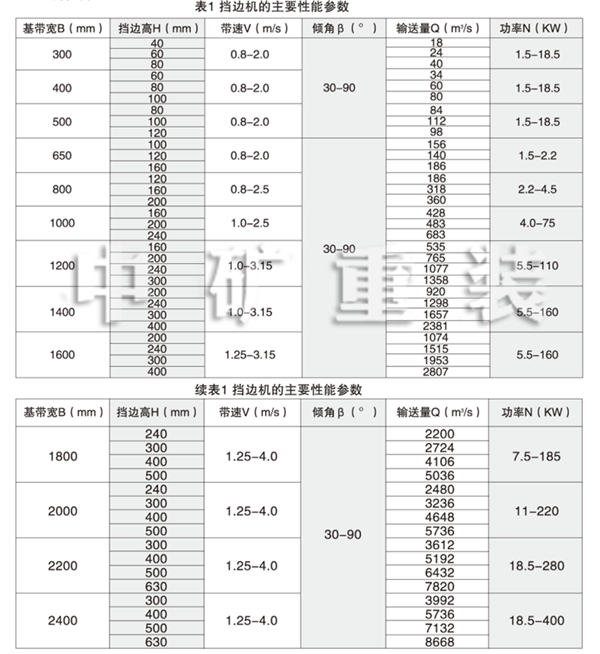 本系列產(chǎn)品的主要性能參數(shù)見表1。表中輸送量式按300傾角、該規(guī)格許用帶速和橫隔板間距計算的。